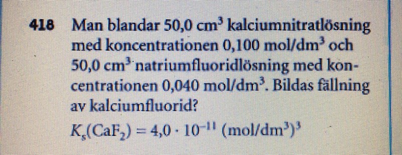 Du vet att . Du kan beräkna och i blandningen innan det sker någon reaktion. Sätt in värdena på koncentrationerna i uttrycket för och kolla om värdet blir större - i så fall bildas det in fällning.