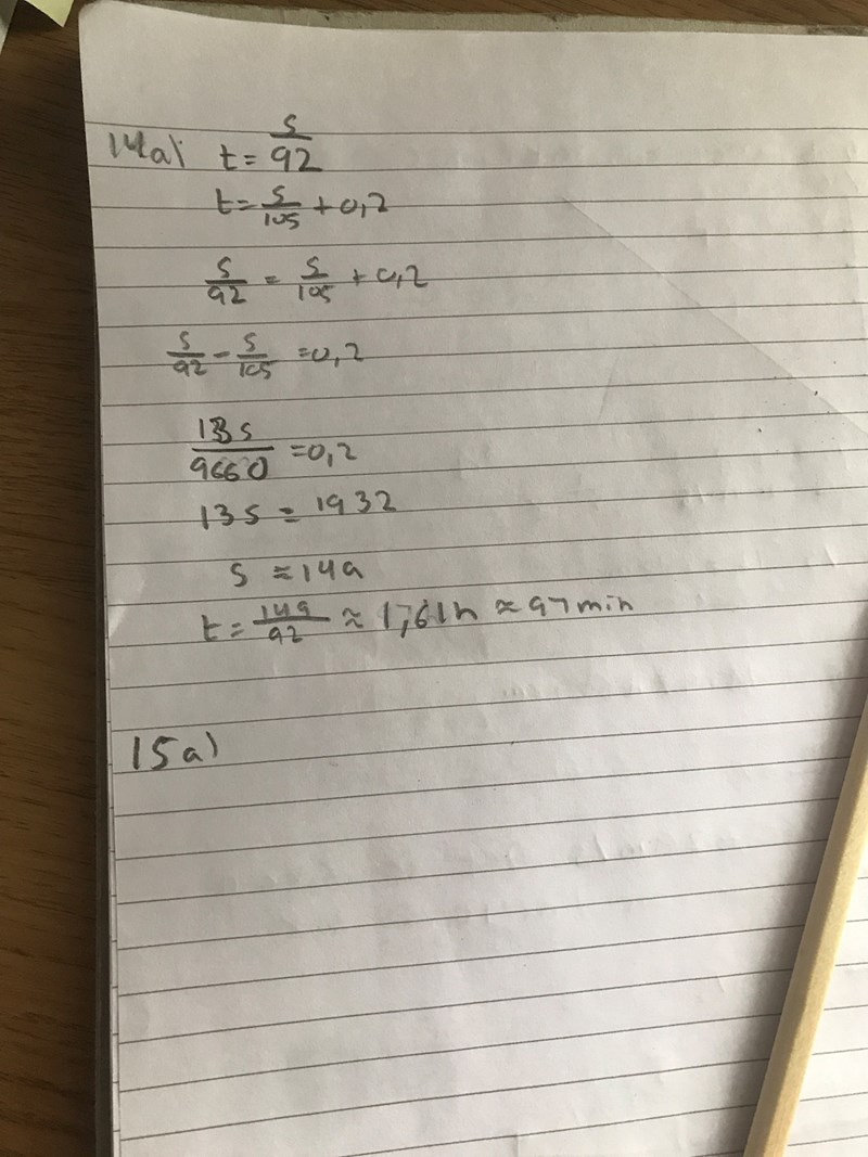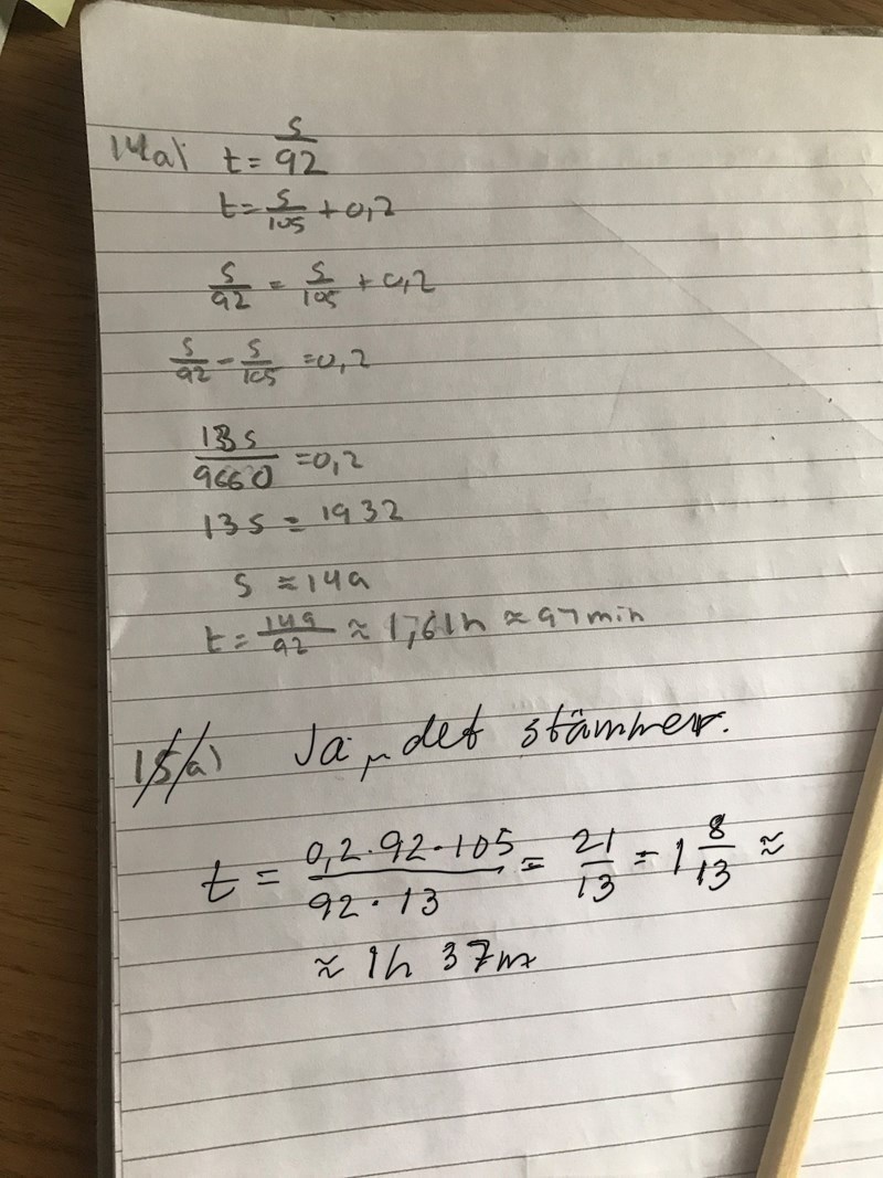 Olof kör på en motorväg med en konstant hastighet av 105 km/h under 12 minuter då han gör en kort paus. Hur lång tid tar resan om medelhastigheten för hela resan är 92 km/h