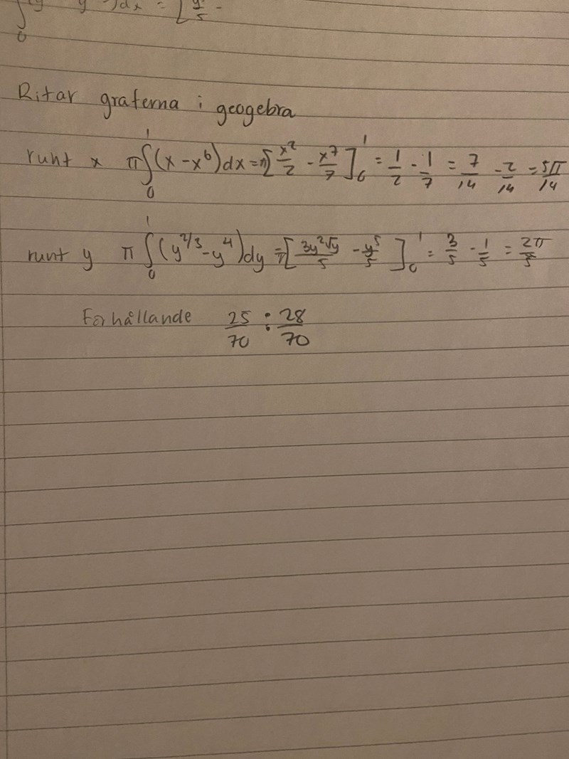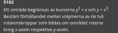 Jag undrar också en till sak. På exemplen i boken och de flesta uppgifter när det kommer till rotering kring y-axeln har de ritat upp funktionerna så att y=.... På så sätt har man kunnat se formen på rotationskroppen som roterar kring y-axeln. Jag kanske tänker helt fel just nu men jag gjorde samma sak. Så jag skrev in y=... för båda mina funktioner. Utifrån det fick jag att var den övre funktionen. Sedan ställde jag upp integralen enligt bilden men med y⁴ - och