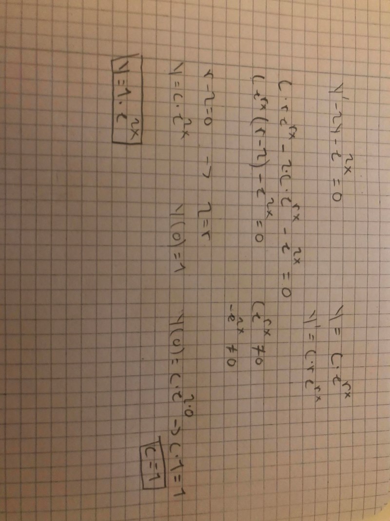 Men lösningen är inte riktigt rätt. Du behäver dels ta fram en allmän lösning till den homogena diffekvationen y'-2y = 0 och dels en så kalla partikulärlösning till diffekvationen y'-2y = e2x. Sätt sedan in att y(0) = 1 så kan du bestämma värdet på åtminstone någon konstant från ekvationen. Känner du igen det här?