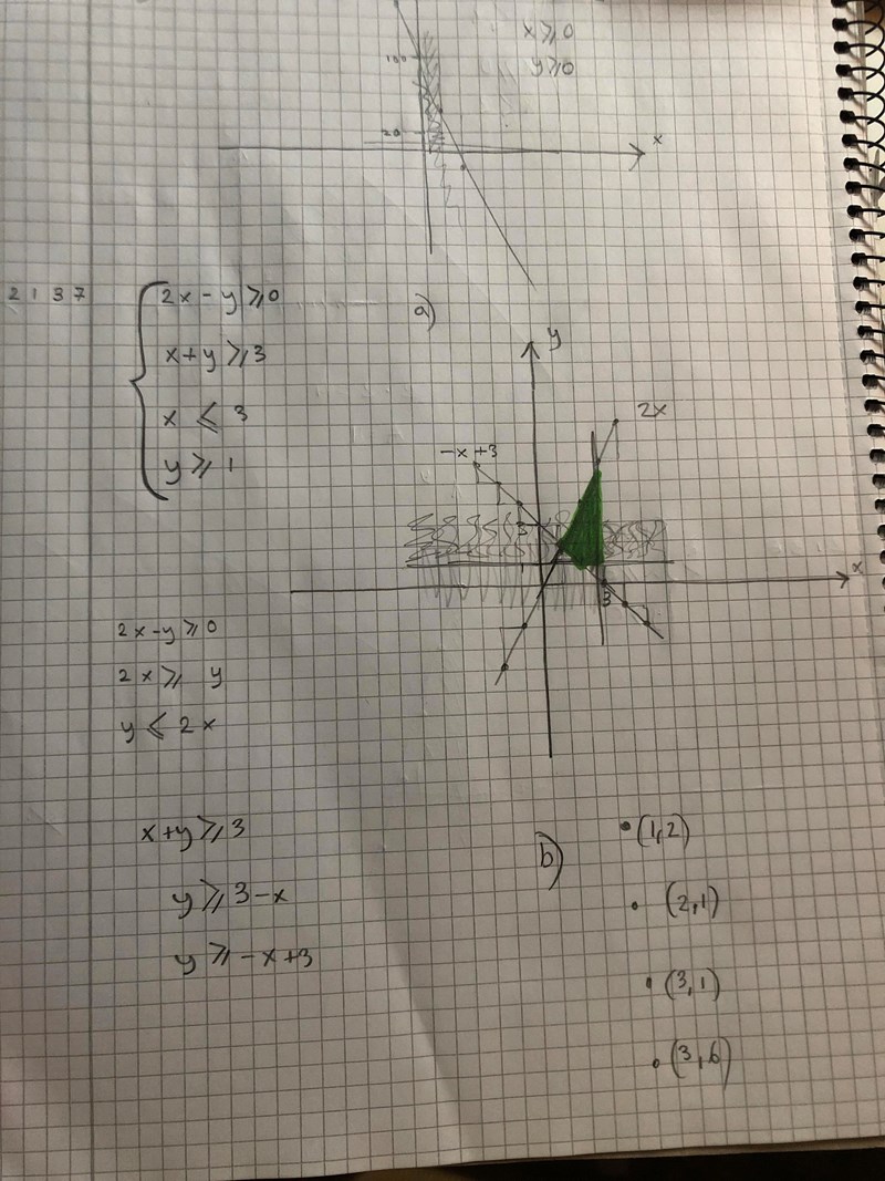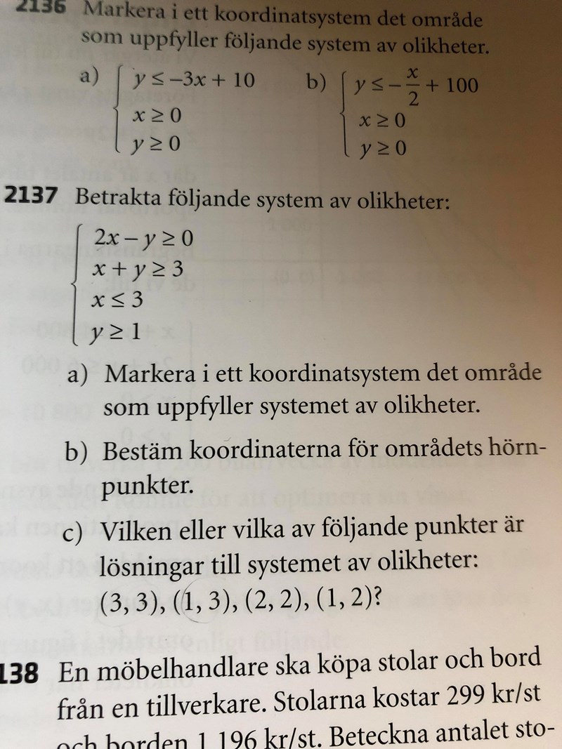 Om du har ett ekvationssystem med 2 likheter så måste lösningen vara ett x-värde och ett y-värde som går att stoppa in i båda ekvationerna. Samma princip gäller när du har ett ekvationssystem med olikheter. En lösning är en punkt (med ett x-värde och ett y-värde) som går att stoppa in i alla olikheterna. Testa t.ex. att stoppa in i alla 4 olikheter, och se om de fortfarande stämmer.