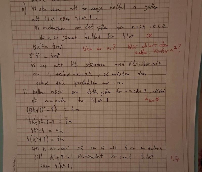 Dvs min slutsats hade då varit såhär " om n är udda så ser vi att 4 är en delare till k^2+k. Påståendet är därmed sant då 4|n^2 eller 4|n^-1". Då hade det varit korrekt eller? Men jag har ju ej definierat vad m är så jag vet ej riktigt om jag hade fått full poäng
