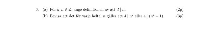 Jag hänger ej riktigt med här. jag ansätter n=2k och n^2 blir lika med (2*k)^2. Jag vill visa att 4|n^2 dvs 4|4k^2. Vi vet att enligt definitionen för delbarhet att det måste finnas ett heltal k eller k^2 sådan att det kan skrivas som 4k^2=4*k^2. Vi kan göra samma sak för n^2-1. Antar att du menar så?