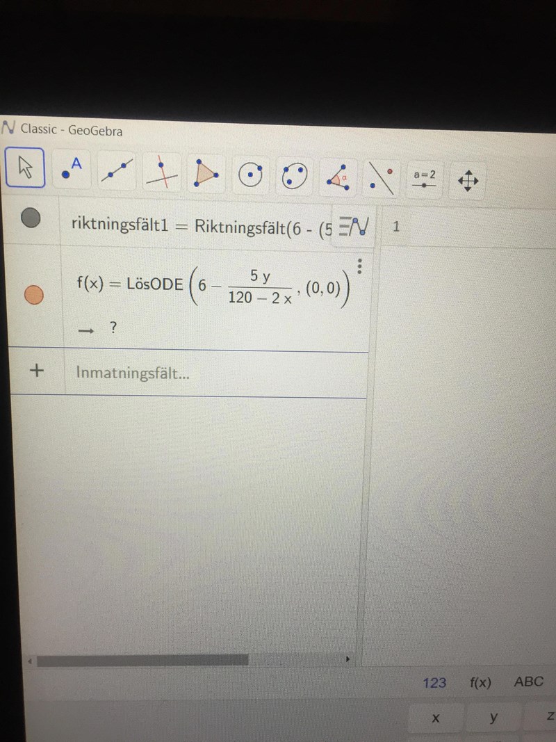 jag använder mig av programmet Geogebra och försöker först och främst att lösa exempeluppgiften. Jag har klarat av att skriva in differentialekvationen, men kan inte få fram lösningskurvan då det bara kommer ett frågetecken. Är det någon som vet vad jag gör för fel eller kan rekommendera ett annat program?