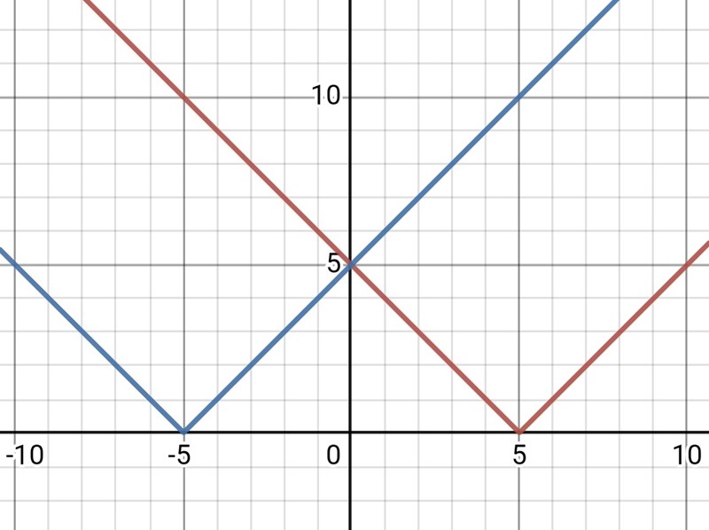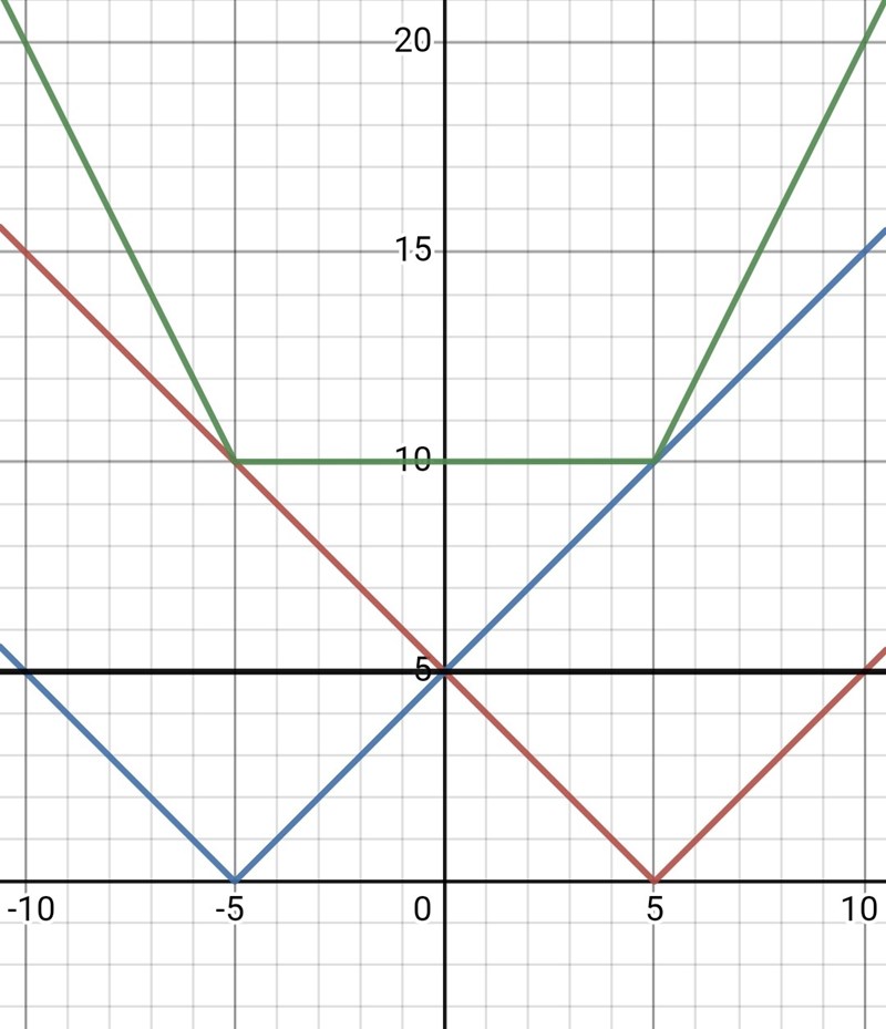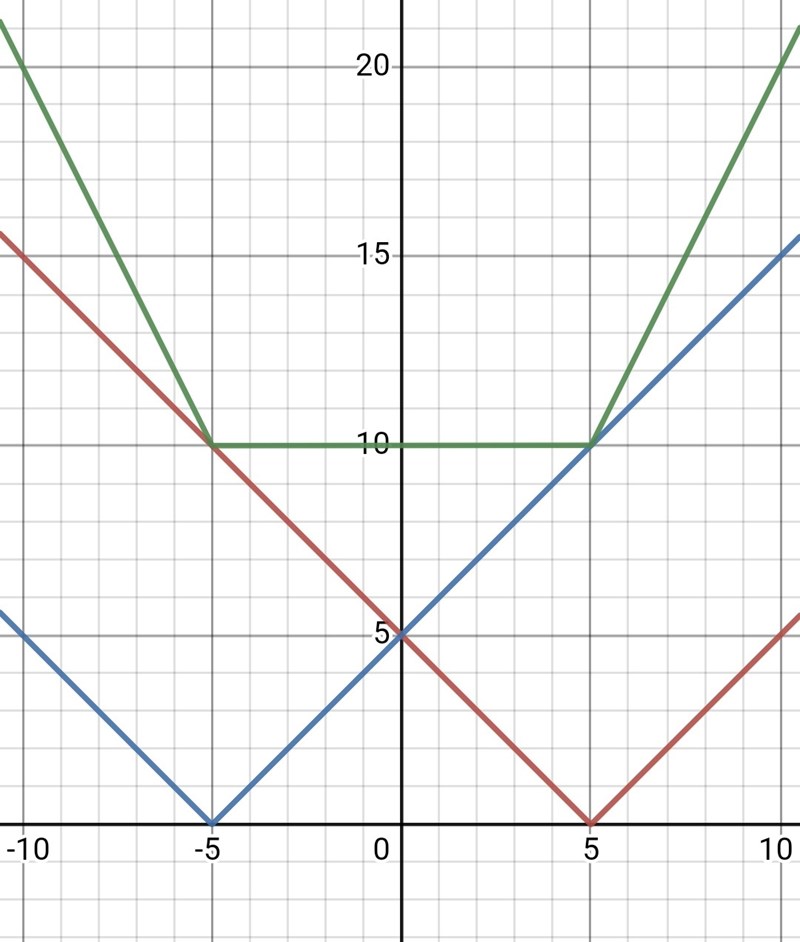 - Addera dessa två grafer till en (dvs addera de två y-värdena för varje x-värde). Du kommer att se att det minsta värdet denna summagraf har är y = 10. Detta är grafen till y = |x-5| + |x+5|, dvs grafen till vänsterledet och den ser ut så här (grön graf):