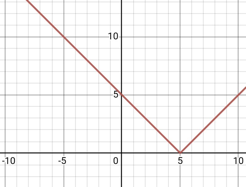 - Rita grafen till y = |x-5|. Den ser ut så här (röd graf). Det är viktigt att du vet varför den ser ut så.