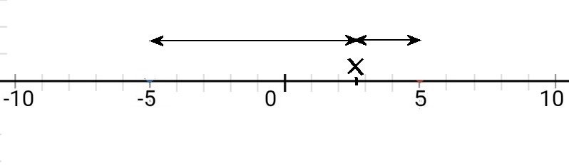 Man kan också tolka vänsterledet som summan av avstånden från en punkt x på tallinjen till punkterna 5 respektive -5.