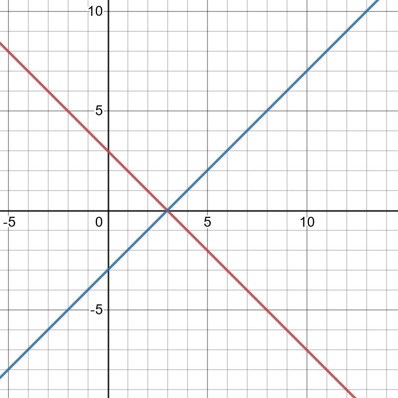 Smaragdalena skrev:Nej, y = x-3 och y = 3-x är inte samma sak. Här är en bild, där den första är röd och den andra är blå: