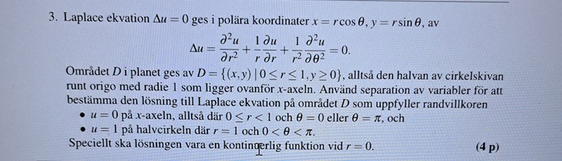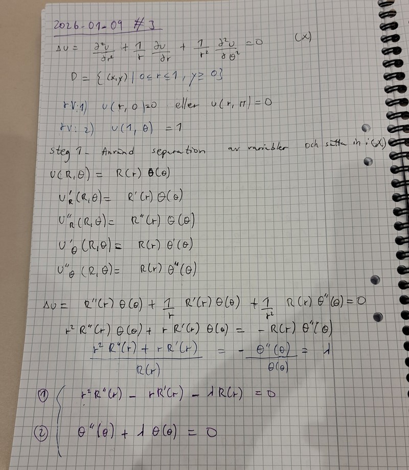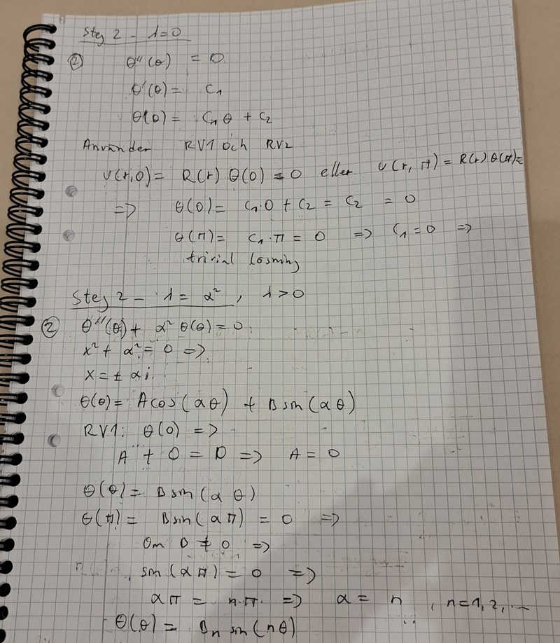 Såhär långt kom jag i min lösning men jag vet inte hur jag ska bestämma k2 i det här fallet för steg 3 där lambda <-alfa2. Det första steget gav mig en trivial lösning och andra steget fick jag då en lösning som jag var nöjd med. Chatgpt fokuserar på att hitta lösning till theta delen med alla 3 fall av lambda och så tar den R-delen sist ,men jag förstår inte varför R-delen ska behandlas sist och hur man ska behandla den då har bara ett randvillkor givet ur uppgiften.