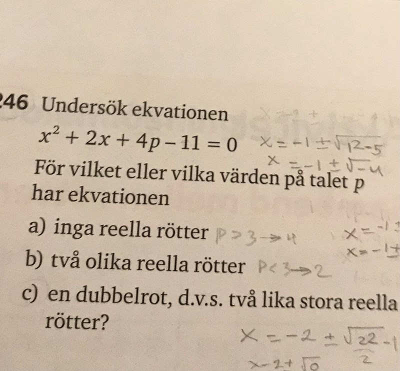 Betrakta 4p-11 aom ett tal, säg c, då har du ekvationen vad säger diskriminanten om antal lösningar?