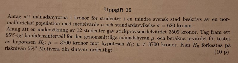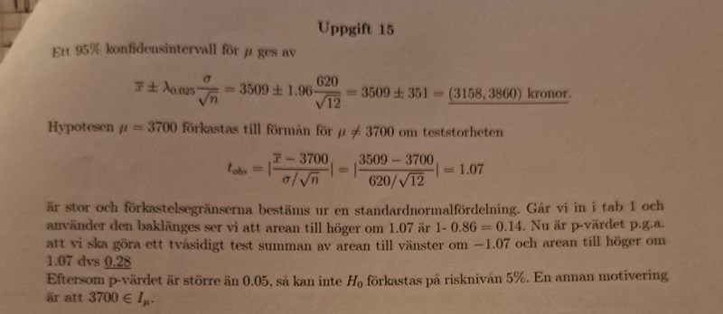 Lösningsförslag till uppgift 15 om konfidenintervall och p-testet