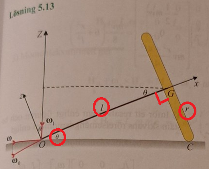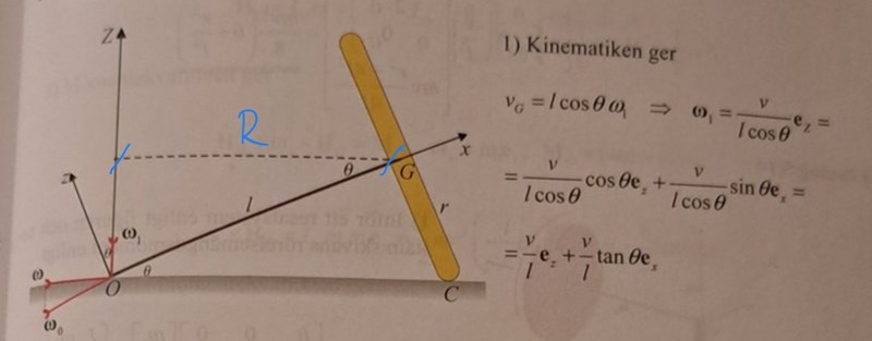 PATENTERAMERA skrev:1. G rör sig på en cirkel med radie R = lcos(theta). Vinkelhastigheten är w1. vG = Rw1. De uttrycker eZ i termer av ez och ex.