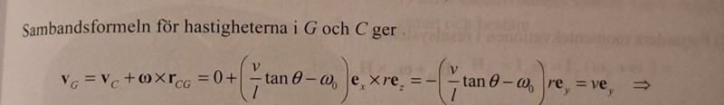 vG = 0 + w1eZ x lex = lw1eZ x ex = lw1sin(pi/2 + theta)ey = lw1cos(theta)ey. Vilket ger att v = lw1cos(theta).