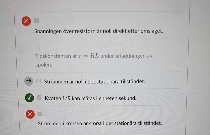 Jag förstår inte varför spänningen över resistorn inte är 0 samt de andra alternativen som jag valde och är felaktiga ? Varför är strömmen 0 vid stationära tillstånd? Det stationära tillståndet är väl när det har gått lång tid som S varit sluten.