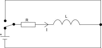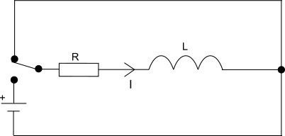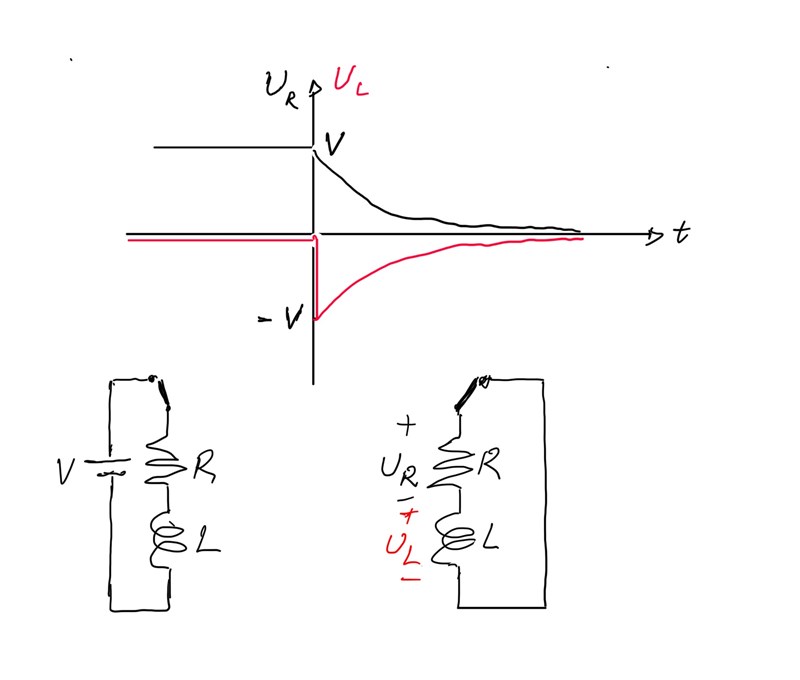 Spolen förutsätts att inte ha någon resistans, så före växlingen är spänningen över den 0 volt medan spänningskällan ger strömmen V/R genom resistansen. Vid växlingen fortsätter strömmen genom spolen att flyta fastän spänningskällan är bortkopplad, så spänningen över resistansen och spolen är lika stora, fast med omvänt tecken. Strömmen genom dem avklingar sedan mot noll med tidskonstanten L/R.