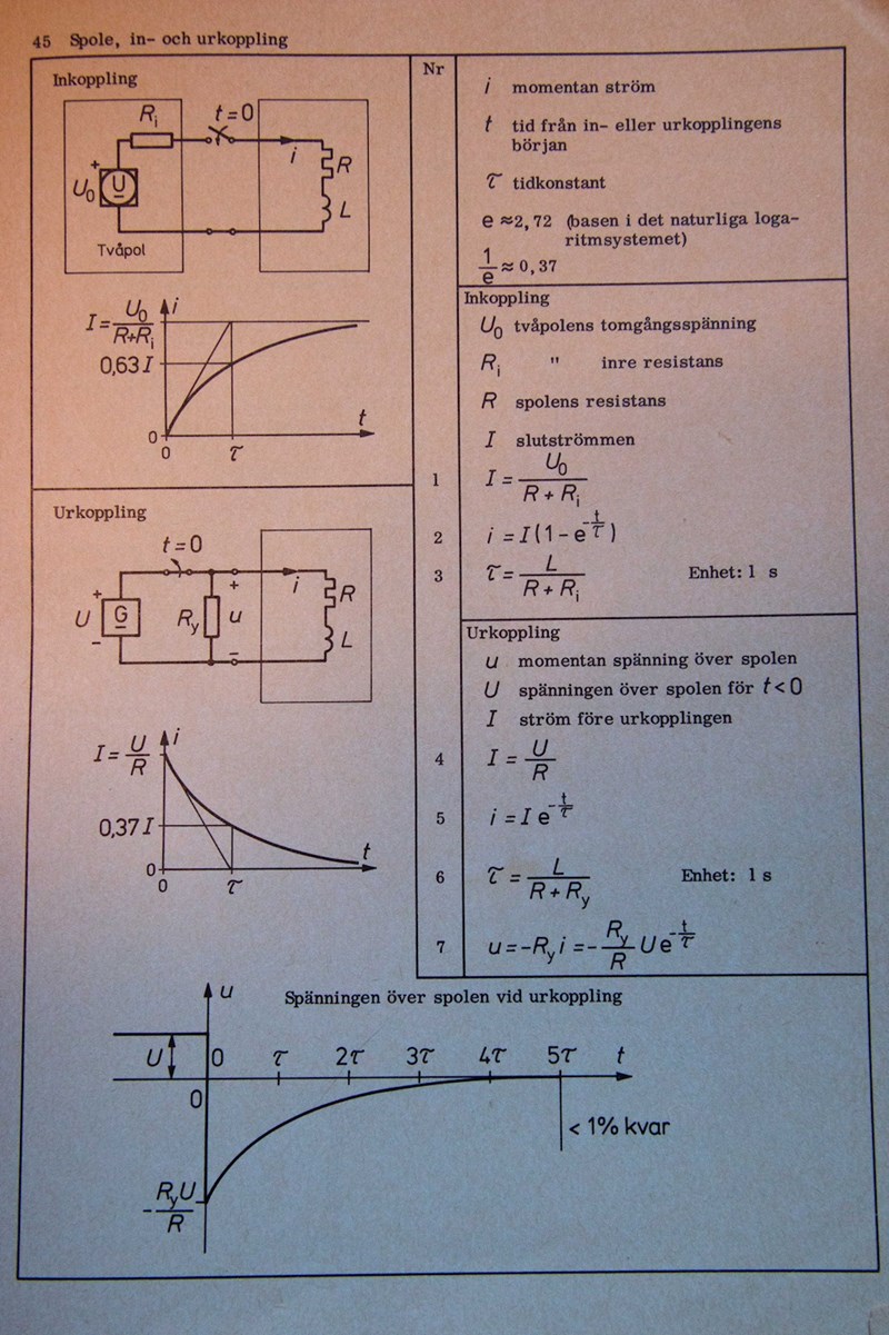 Jan Ragnar skrev:Spolen förutsätts att inte ha någon resistans, så före växlingen är spänningen över den 0 volt medan spänningskällan ger strömmen V/R genom resistansen. Vid växlingen fortsätter strömmen genom spolen att flyta fastän spänningskällan är bortkopplad, så spänningen över resistansen och spolen är lika stora, fast med omvänt tecken. Strömmen genom dem avklingar sedan mot noll med tidskonstanten L/R.