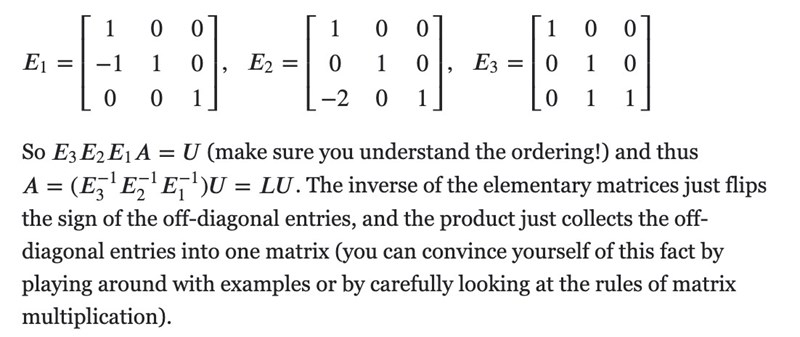 Från vad jag har sett ska lösningen skrivas på följande sätt, är min uppfattning korrekt att varje steg i lösningen som bokförs till L-matrisen skrivs som inversen av de elementära matriserna, E1, ..., Ep? Inte klart för mig hur man inverterar dessa eller hur man kommer fram till de. Enligt detta utdrag ur math stackexchange har de skrivit såhär, där diagonalen verkar ha bevarats men att man byter tecken på de siffror som läggs in i matriserna.