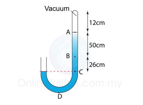 Här är trycket på kvicksilvret vid A nära 0 Pa (det är därför de har tonat ut det blåa - en del av kvicksilvret avdunstar p.g.a. det låga trycket). Vid C är trycket 1 atm (ca. 100 000 Pa) om vi antar att röret befinner sig vid jordytan. Allt kvicksilver mellan A och C bidrar till att trycket ökar från 0 toll 100 000 Pa mellan A och C, mg/A är inte försumbart jämfört med trycket vid rörets öppning t.v.