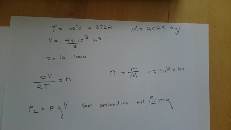 Delall skrev :Jag har fastnat på samma fråga och undrar hur ni kom fram till att densiteten för luften i ballongen är 0,94? Jag får det till 1,5 när jag räknar med formeln P*V/T=konstant..