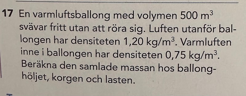 Det är meningen att du skall räkna ut vilken massa ett klot av kall luft med volymen 500 m3 har, och vilken massa ett klot av varmluftmed volymen 500 m3 har. Eftersom ballongen ine rör sig, är summan av alla krafter på den konstant, så massan för varmluft+ballonghölje+korg+last = massan för den kalla luften.