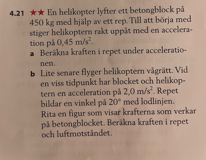 - Men sedan (i b-uppgiften) så flyger helikoptern vågrätt med en (vågrät) acceleration på 2,0 m/s2.