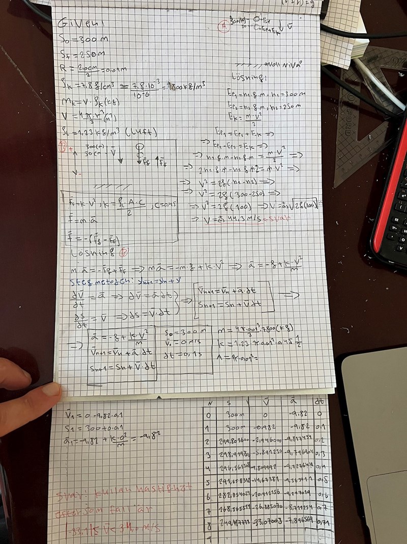 En stålkula släpps utan begynnelsefart från en luftballong på trehundra meters höjd. a) Beräkna dess hastighet efter 50 m fritt fall. Luftfriktionen försummas.
