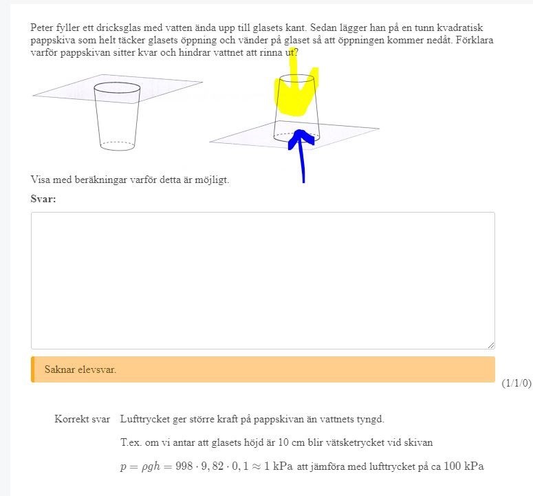 Pappskivan påverkas av två krafter, en nedåtgående som beror på vattenpelarens höjd och en uppåtgående som är atmosfärstrycket gånger arean paA. Villkoret för att pappret ska hållas kvar mot glaset är att den uppåtgående kraften (den blå) är större än den nedåtgående (gul)