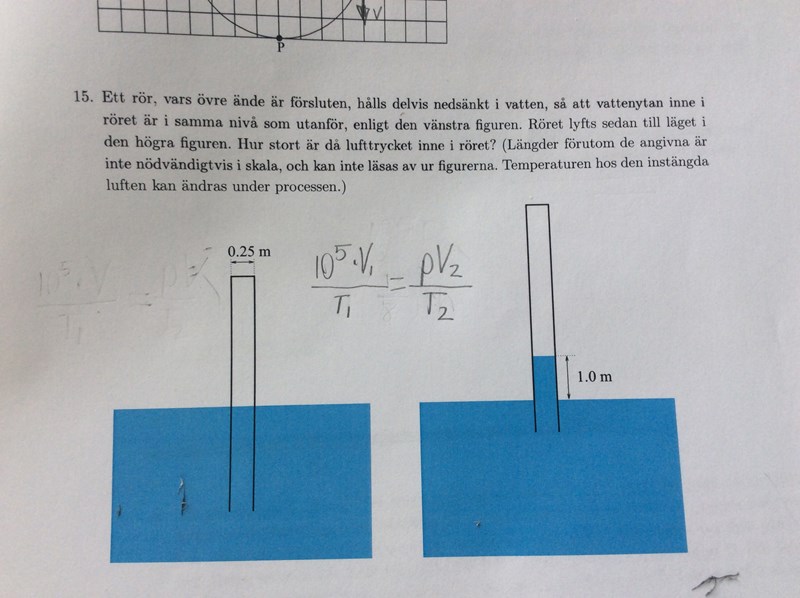 Mathkin - jag tror att ditt svar är korrekt uträknat, men verkar som att ditt svar är fel enligt matematik och fysikprovet 2008. Detta är uppgift 15 från matematik och fysikprovet från året 2008. Svaret som står i facit är 92kPa. Detta svar är tänkt att man ska få utan miniräknare. Alltså avrundningar måste ske på vägen för att uppnå detta svar. Har du någon aning om vilka avrundningar som man måste ha gjort för att få detta svar?