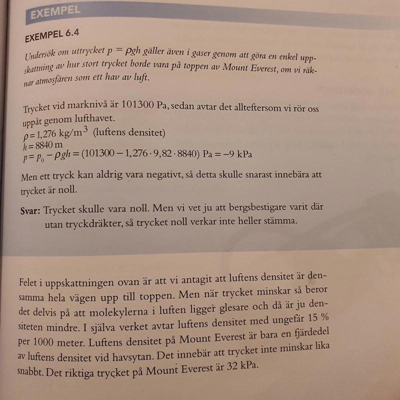 Även om jag använder rätt densitet i uträkningen blir väl svaret inkorrekt? För jag kan tänka mig att det inte hjälper att bara ange lufttrycket vid en viss höjd i atmosfären. Eftersom alla luftmolekyler ovan är olika täta råder ju en annan situation än i havsmiljö. I havet är ju det jämt tätt över allt.