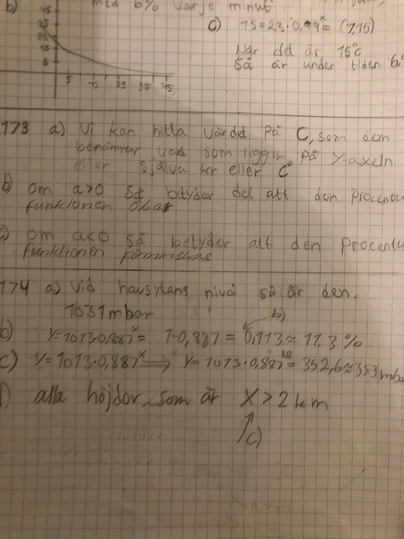 c) Här har du ställt upp att lufttrycket är 8800, och beräknat vad höjden måste vara då. Kom ihåg att x är höjden och y är trycket, så byt ut x mot 8800 istället för y.