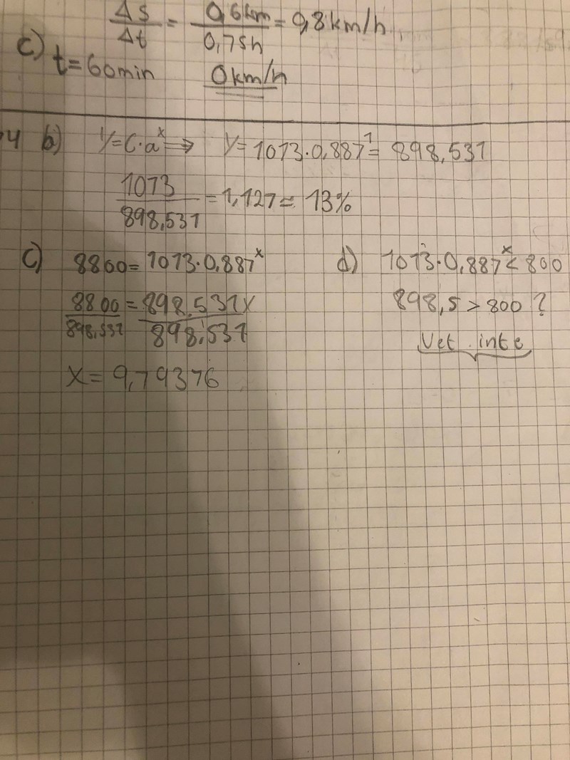 b) Det du har beräknat är hur många procent trycket ökar om höjden minskar 1 km, vilket inte är samma som om man går åt motsatt håll. Om du vänder på bråket blir det rätt. Det går också att se svaret i själva funktionen, eftersom förändringsfaktorn är 0,887 för varje km.