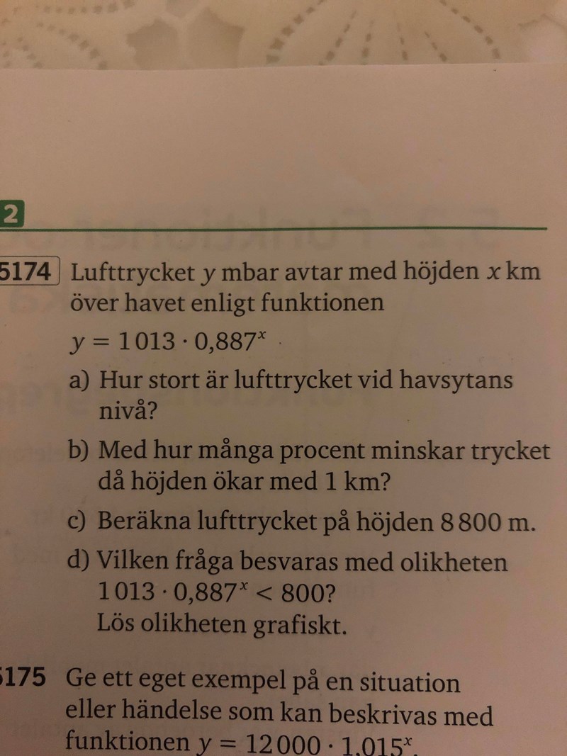 d) är ju funktionen för lufttrycket. Olikheten säger alltså att trycket är under 800 mbar. Löser man olikheten får man reda på vad x (höjden) måste vara för att trycket ska vara under 800 mbar. De vill att du löser den grafiskt, så börja med att rita in funktionen på räknaren och se om du kommer vidare!