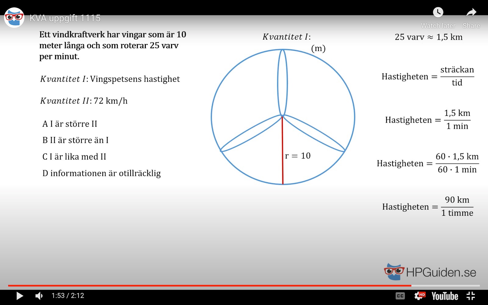 Frågan gäller ju vingspetsens hastighet och den rör sig utefter omkretsen. Mittpunkten på vingen rör sig med halva hastigheten.
