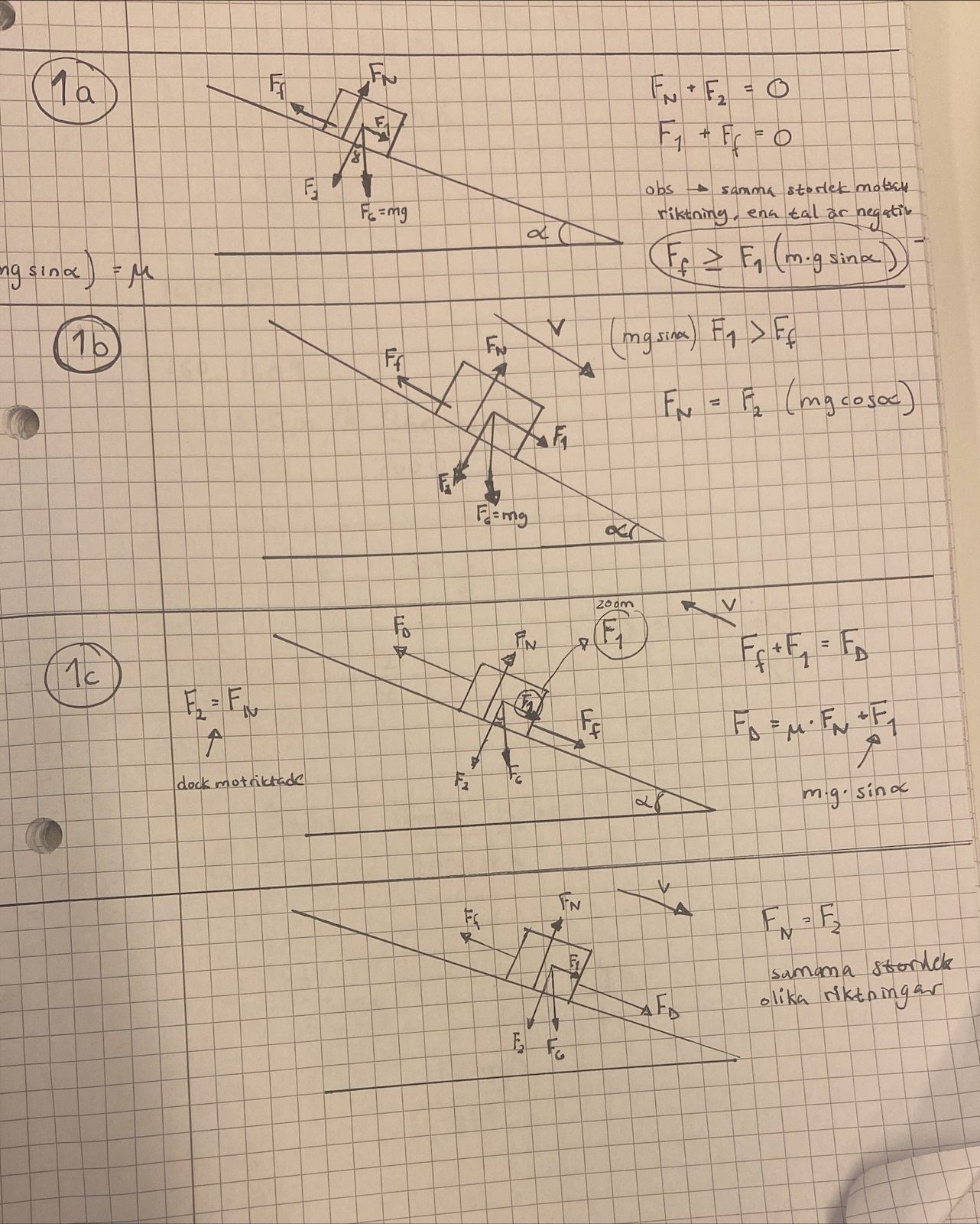 Blev lite förvirrad över F1 funktion då det är en kraft uppdelning av Fg=mg, men verkar den i en speciell riktning? På uppgift 1d har jag ritat ut pilen åt samma håll som F(D)