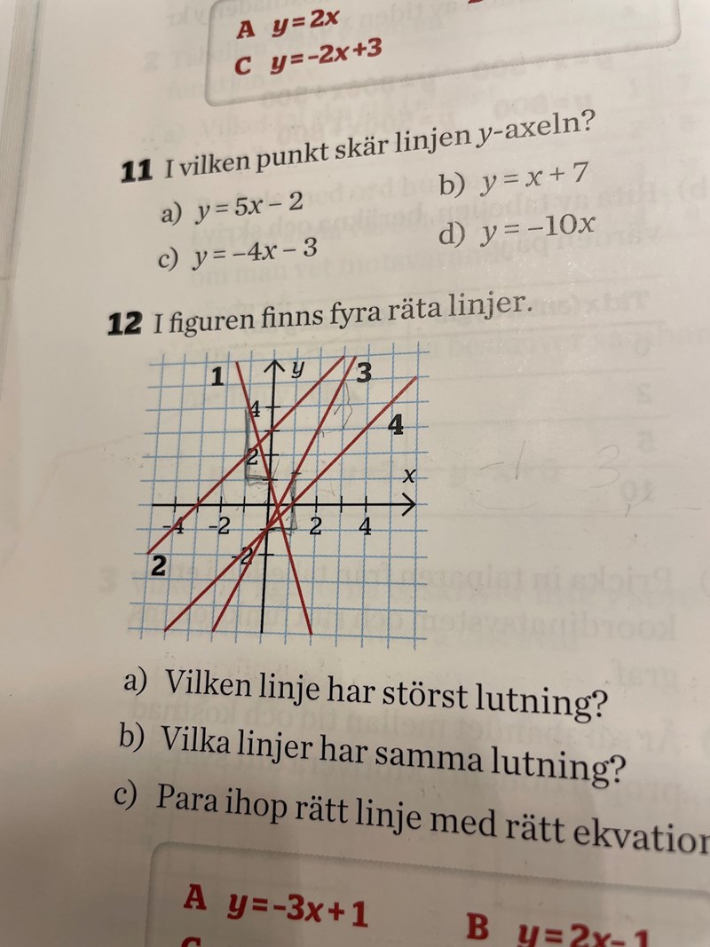 fråga a) är vilken linje som har störst lutning, för att få fram ett svar så undersökte jag alla linjers K värde. Linje nummer 1 hade det högsta K värde på 3x och därför trodde jag ser var svaret men det visade sig att svaret linje 3 som det stod i facit som endast har K värdet 2x. Beror detta på att linje 1 är negativ eller vad har jag gjort fel?