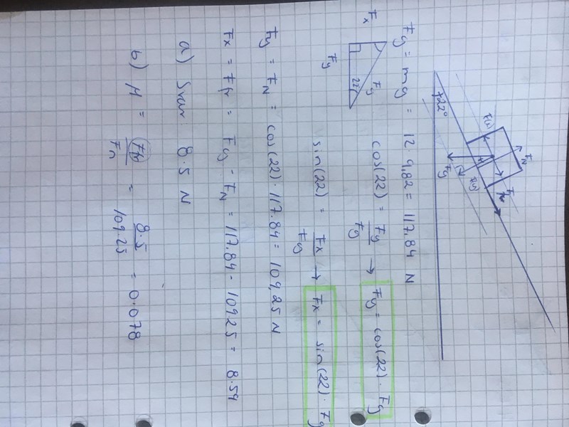 Vi börjar med att beräkna Fx: sin 22 = Fx/mg --> sin 22 = Fx/12*9,82 --> Fx = 12*9,82*sin22 ≈ 44 N. Ser också att du ska beräkna verkningsgraden. Nu har du friktionskraften, och jag ser dessutom att du har beräknat normalkraften, vilket är de verktyg du behöver för att lösa b. Lycka till!