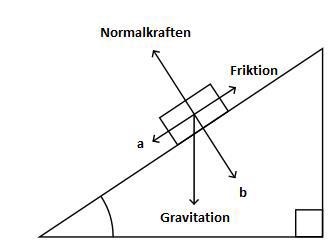 Kan du ställa upp den ekvationen? De aktuella krafterna är friktionskraften (som vill motverka rörelsen) och tyngdkraftens komposant utmed planet (som vill motverka rörelsen)