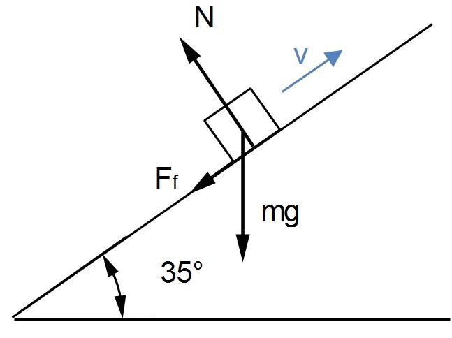 Klossen rör sig uppför planet utmed planet (med hastigheten v, blå pil i figuren)