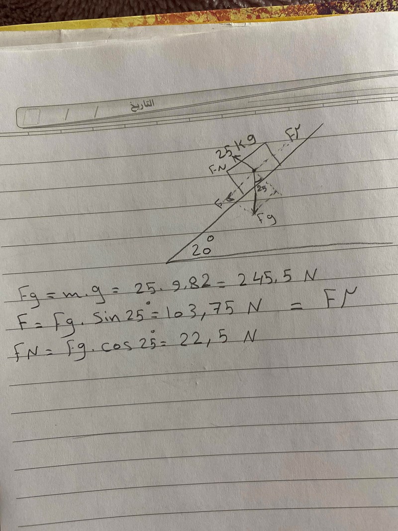 Frågan handlar om att bestämma och räkna samtliga krafter på en låda som väger 25kg och ligger på en lutande plan med vinkel 20.