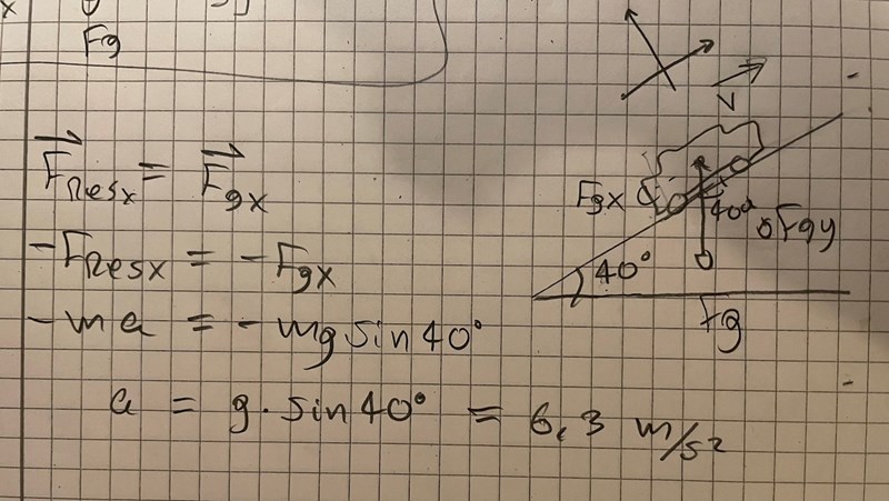 Jag förstår inte varför jag får fel tecken på accelerationen. Som man kan se har jag valt negativ riktning neråt längs planet. Bilen accelererar också nedåt och då borde svaret bli -6,3 m/s^2. Varför blir det fel?