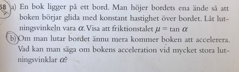 Jag har börjat tänkt såhär: om lutningsvinkeln ökar kommer boken att accelerera ännu snabbare, men jag vet inte hur jag ska visa detta matematiskt