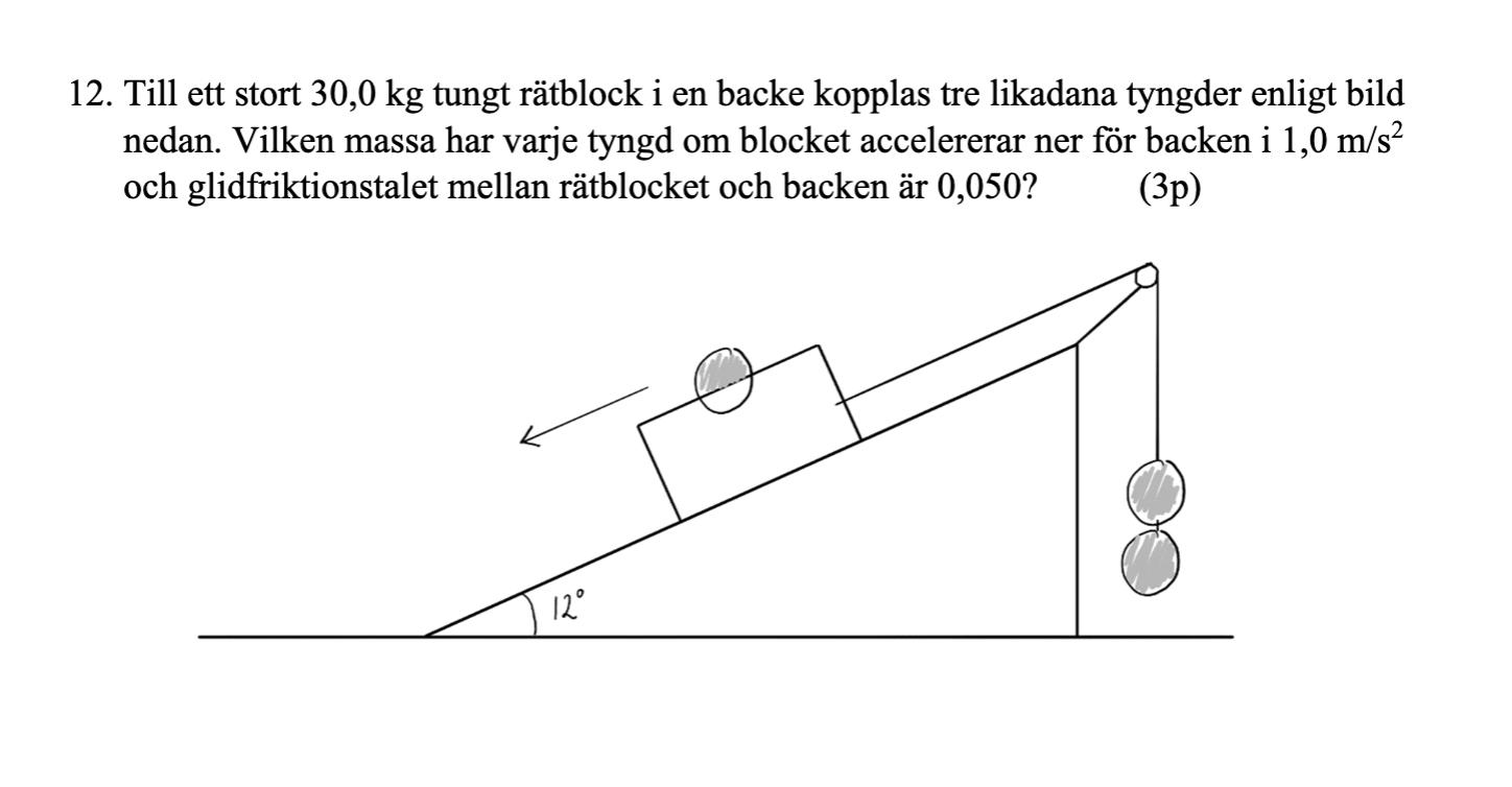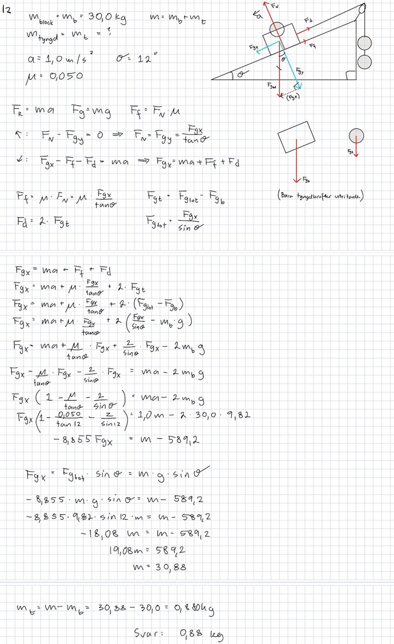 Ftyngdkraftskomposant är (30+m)g*sin(12)