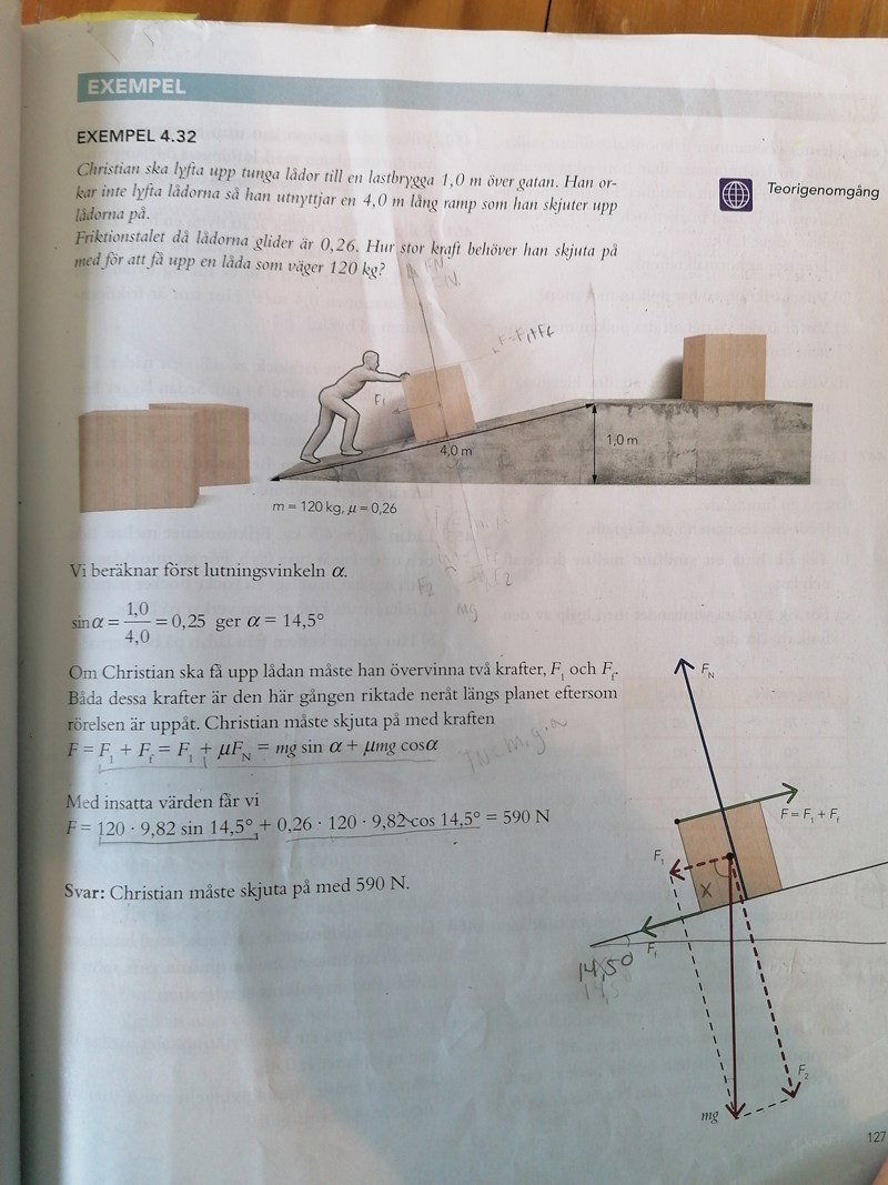 alfa fås till 14.5° m.h.a sitt trigonometriska samband. Därefter ska utförda kraften beräknas. Denna kraft fås till 590N m.h.a omskrivningarna. Jag uppfattar som att vinkel x är samma sak som alfa. Men det verkar som att x är lite större än alfa. Det tycks som om boken försöker göra något som jag ej förstår hur. Det hade varit bra med en bild eller skiss på det hela. Sedan försöks myFN att beräknas. Då vinkeln ser lika stor som alfa är då cosalfa=cos14.5. Det kan jag hålla med om. Men inte hur x=14.5° skulle kunna antas men också användas i det trigonometriska sambandet. Liksom alfa ligger ju långt bort från skissen typ.