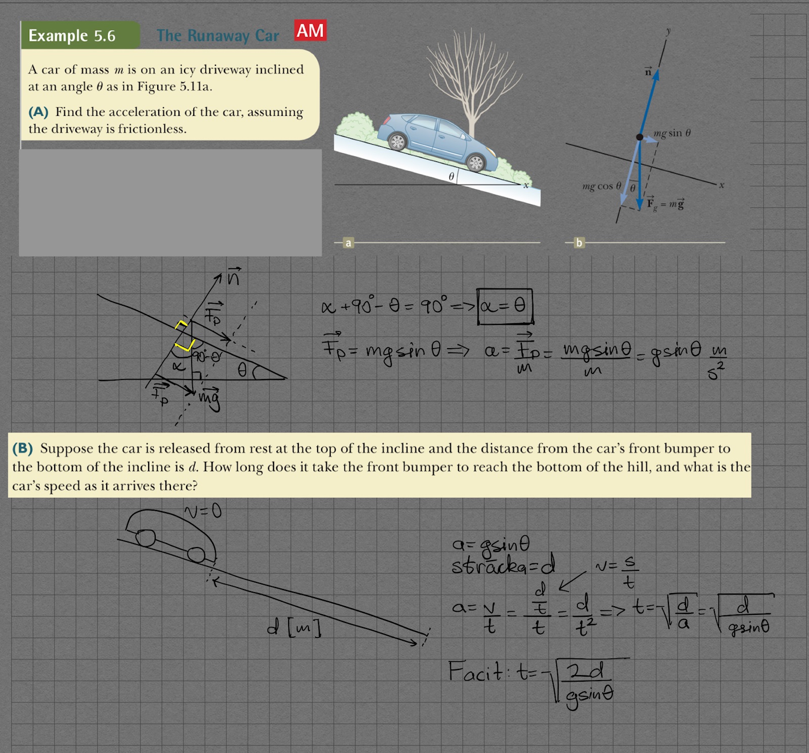 Du har räknat med konstant hastighet dvs den hastighet bilen har i slutet på backen, men i verkligheten ökar bilens hastighet från 0 till sluthastigheten,