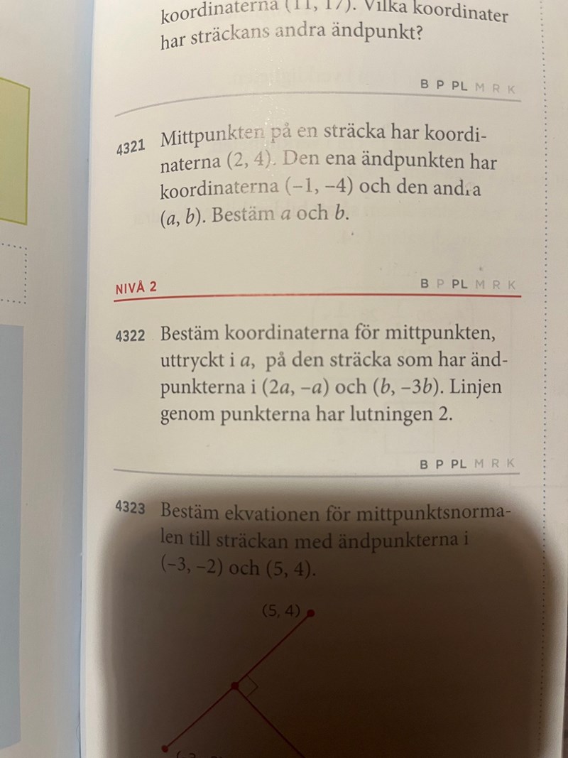 Uppgift 4322. Antar att man ska använda mittpunktsformeln men vet inte hur man ska få in lutningen i formeln.