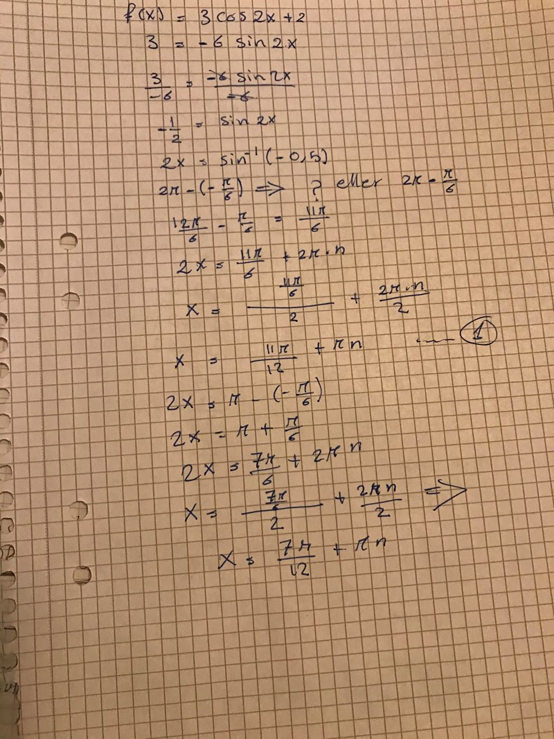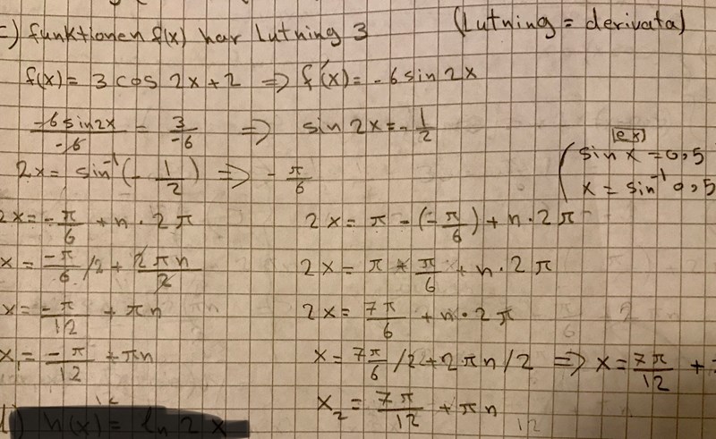 f(x) = 3 cos 2x+2 som har lutningen 3 bestäm x värdet