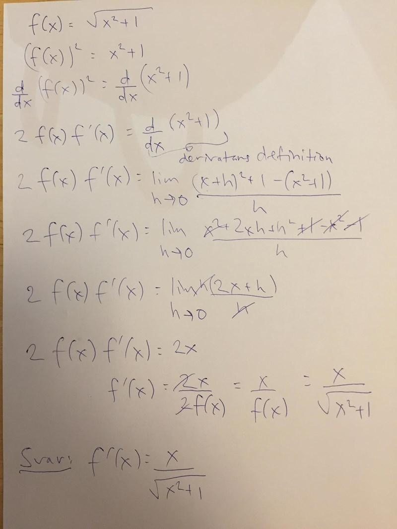 Om vi tillåts på förhand veta derivatan av uttryck som inte är , betyder då "med derivatans definition" bara att vi använder derivatans definition någonstans i uträkningen?