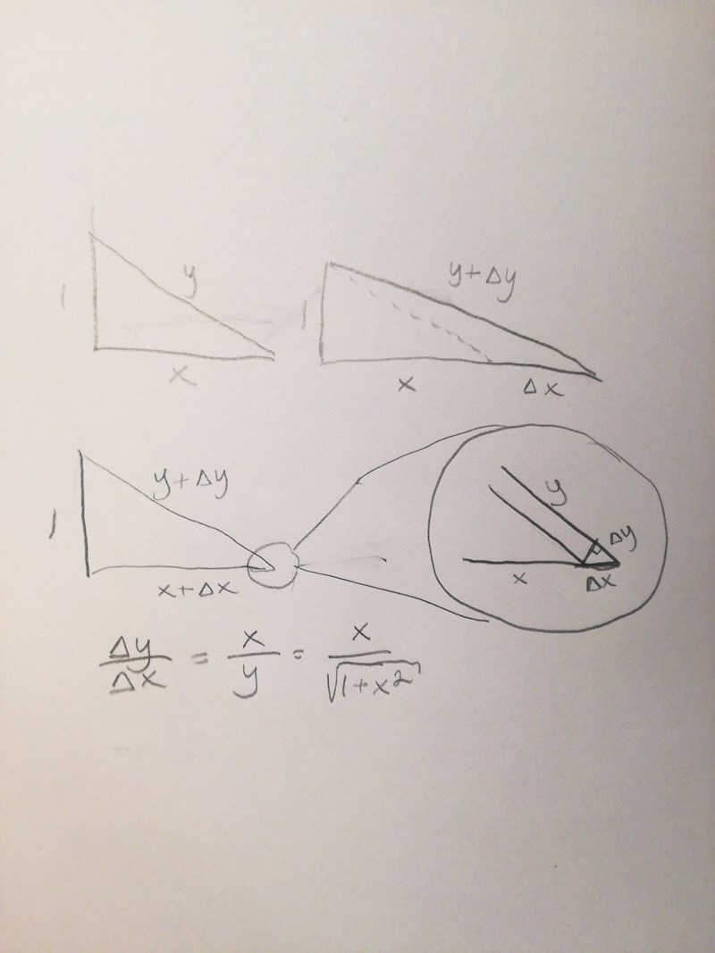 Om någon såg 3blue1browns Calculus done right serie så fanns däri en hel del eleganta geometriska bevis för derivatorna av olika trigonometriska funktioner och man kan applicera några av de ideerna på denna funktion då det geometriskt motsvarar hypotenusan till en rätvinklig triangel med kateter 1 och x.