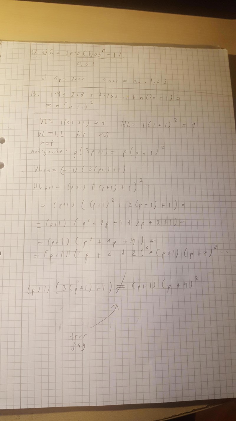Sedan måste du också visa att om antagandet gäller så kommer VL(p+1) att bli samma som HL(p+1). Jag kan inte se att du räknar ut vad VL(p+1) blir någonstans. Du gör det för HL(p+1), men du gör ett räknefel på slutet. Prova att räkna om det och sedan göra samma sak för VL(p+1), och se om du kan visa att det blir samma.