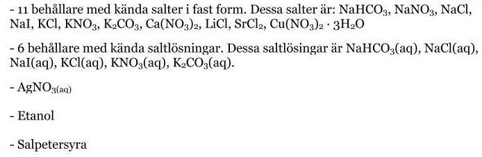Jag håller på med en laboration där man ska bestämma beståndsdelarna i ett okänt salt. I en konversation med min lärare sa han dels att "anjonen finns bland de joner som du kan hitta hos de salter som är kända" men också att det okända saltet alltså skulle kunna vara en hydroxid. Saken är bara den att jag verkligen inte lyckas se att något av salten innehåller hydroxidjoner. Jag bifogar en bild av det vi har tillgång till så om någon skulle kunna hjälpa mig och ge en hint om vad jag missar skulle jag bli överlycklig.